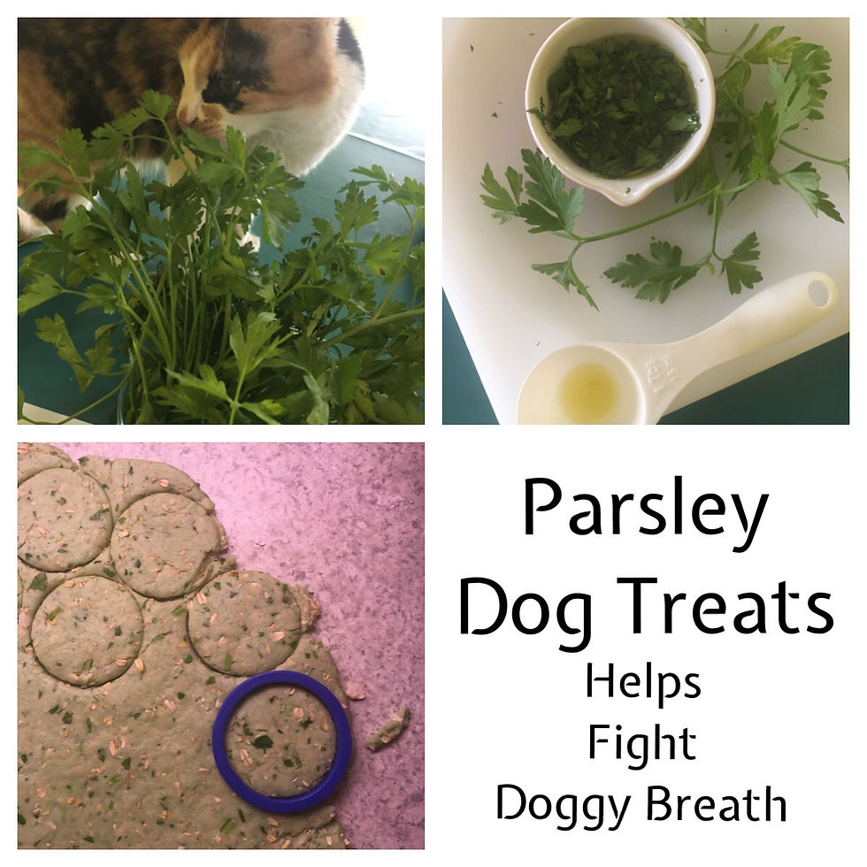 For our next treat lets try a scenario. One of my dogs often has bad breath. Aside from all of the typical ways to prevent bad dog breath, using parsley is a good solution for this issue. I sprinkle fresh parsley on her dog food daily and make her treats when her breath is really bad. Once again I use my Basic Dog Treat Recipe and add parsley to the recipe to help control Maddy’s bad breathe issues. If your dog really likes the taste of parsley you can make the treats stronger by actually heating two teaspoons of fresh chopped parsley in the olive oil before making the treats. It is wicked easy to create homemade, healthy dog treats according to your dog’s dietary needs.
